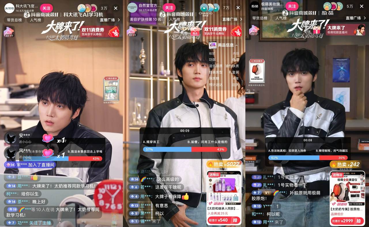 在薇诺娜的直播间里,男主角纪舟野不再只是推选居品,而是化身死事中东说念主,用修白水乳演绎了一场“赞助因皮肤问题被排挤的共事”的原宥戏码;在好意思妆品牌当然堂的直播间,一瓶精华、一个凝时肌活礼盒,以至能成为看穿交易间谍、推动剧情走向的要道说念具;在科大讯飞的直播间,AI学习机当作“破局要道”,化解指导功课的风雨飘摇,成立垂死的亲子联系......