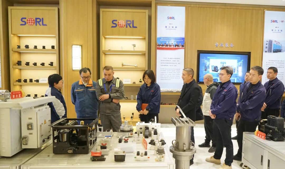 在瑞立集团践诺中心大厅,集团总司理余锦瑞正向王军、张中华一转,以及随同来访的温州市总工会党构成员、二级调研员吴客竹,温州劳模工匠智能制造东谈主才学院院长郑谈友,瑞安市总工会党组布告、常务副主席池志刚等指令,先容轨谈无油风源系统。
