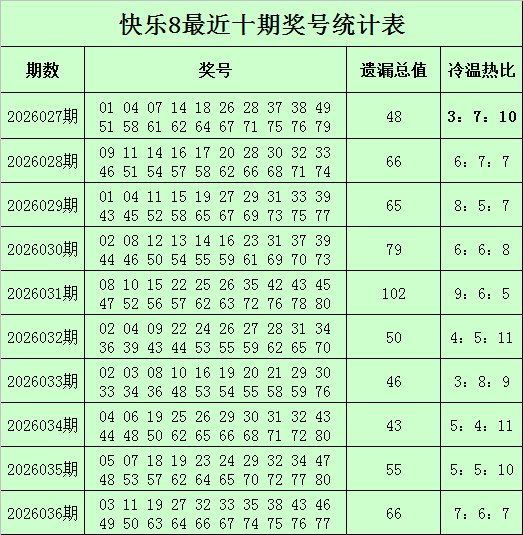 福彩兴奋8第2026036期开奖转头:03 11 19 27 32 33 35 38 43 46 49 50 63 64 66 67 74 75 76 77,其中冷温热码比为3:7:10,遗漏总值为66。